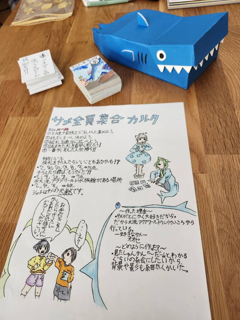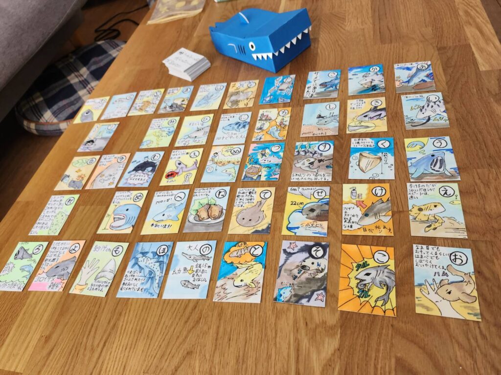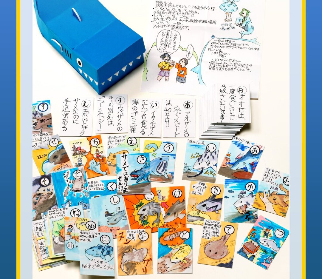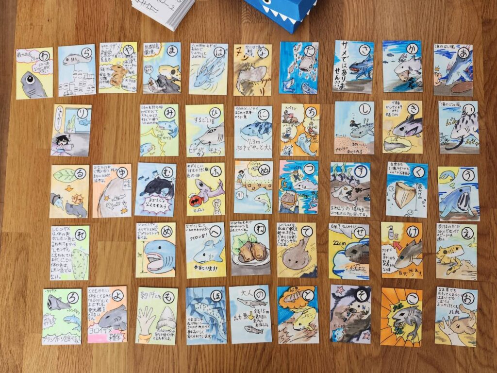 陽愛さんは、日本水産学会会長賞の創作部門で「サメ全員集合カルタ(工作)」を作って選ばれたそうです。これがそのカルタ!確かによく出来ています。